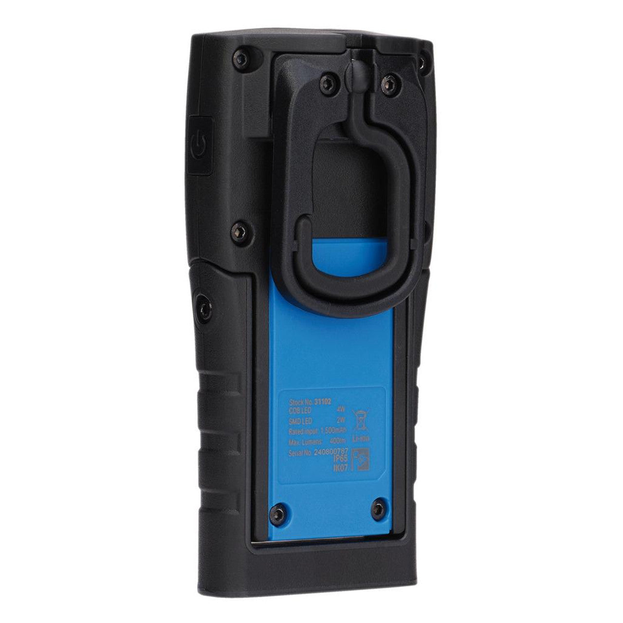 This ultra-thin inspection light is lightweight and easy to carry. It provides a wide angle of illumination and features a long-distance torch beam for added versatility. It includes a 180° swivel stand for adjusting the beam direction, as well as strong magnets on the back and base, and an integrated hook for hands-free use. The back-mounted clip allows it to be attached to a front pocket for close inspection work. Powered by a rechargeable lithium-ion battery, it comes with a USB port for easy charging using the provided USB-C cable. Additionally, it has an LED indicator to show the charging status and a low battery warning. The light is made of robust plastic, capable of withstanding a 2m drop, and is also water-resistant.