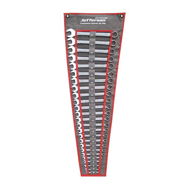 The Jefferson JEFCSS25-MP is a premium 25-piece combination spanner set designed for durability, precision, and ease of use. Manufactured from high-quality chrome vanadium steel with a polished mirror finish, each spanner offers excellent resistance to corrosion and wear.