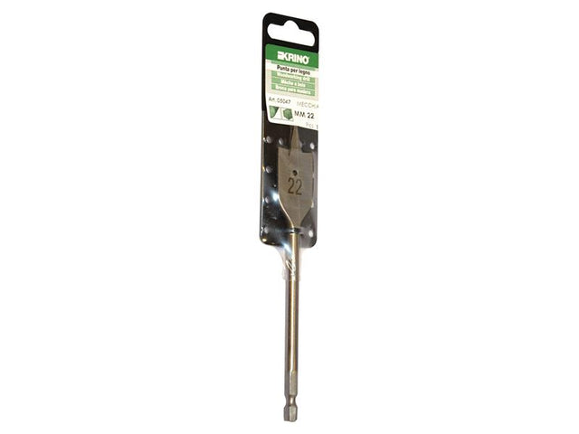 1 x Krino Flat Wood Drill Bit 22 x 150mm supplied in retail packaging with a hanging hook.