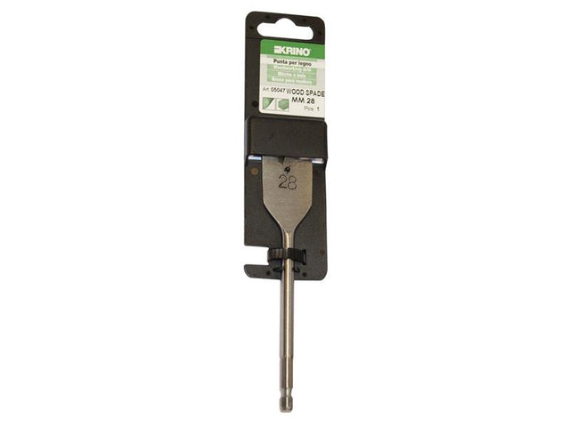 1 x Krino Flat Wood Drill Bit 28 x 160mm supplied in retail packaging with a hanging hook.