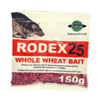Rodex 25 Whole Wheat Bait 150g for the control of mice and rats. Rodex 25 Whole Wheat Bait is a ready-for-use bait formulated using food grade micronised (high temperature treated) wheat. Should be used in tamper proof bait boxes. Contains bromadiolone 0.0025% and denatonium benzoate 0.001%.