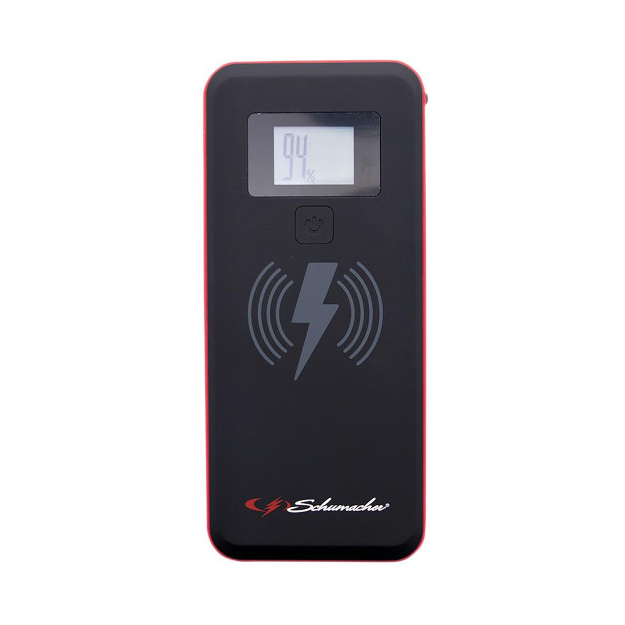 This compact Schumacher lithium jump starter and power bank is designed for on-the-go charging. Its advanced 16V 4-cell lithium technology provides superior starting performance for jump-starting 10L petrol and 7L diesel engines with 12V dead batteries. The Pre-Boost technology pre-charges deeply discharged batteries, and the Pre-heat mode warms the battery for optimal starting in low temperatures. The built-in flashlight offers flashing and SOS modes for emergency use. There is an easy to read LCD screen. In addition to jump-starting cars, the unit functions as a powerful battery pack offering wireless charging for Qi compatible devices and a USB-C output for charging mobile devices. For safety, the unit protects against reverse polarity, short circuit, low voltage, high temperature and reverse charging. Includes a smart cable with battery clamps, USB-C charging cable and storage case.