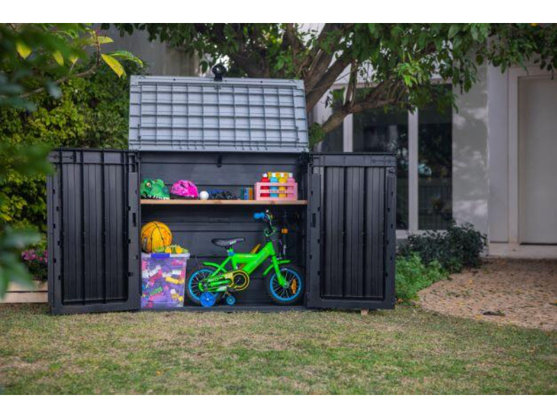 The versatile plastic outdoor storage cabinet with two doors and a lid opens easily by means of gas springs. As this item is made of plastic, it is easy to clean and also maintenance free. Thanks to its wooden-like structure, it will certainly not look out of place in your garden. At the front, the sloped threshold makes rolling heavy items in and out easy, and a 3-doors locking system is integrated for added security (padlock not included). The cabinet has an impressive storage capacity, making it perfect to store your garden equipment, bikes or garden furniture, there even fit two 240 L trash containers!