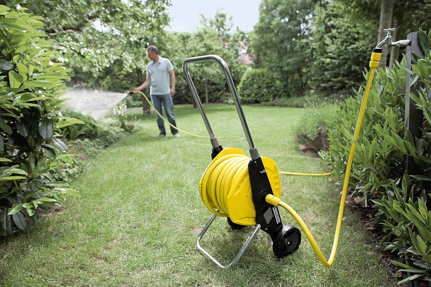 The ready-to-use Hose Trolley HT 3.420 Kit 1/2" serves perfectly when watering mid-sized to larger areas and gardens. Thanks to its innovative folding function, it can be stowed away without difficulties and very space-saving. The features: height adjustable handle, 20 m 1/2" PrimoFlex® hose, Nozzle Plus (2.645-177), 3 x hose connector, 1 x hose connector with Aqua Stop, G3/4 tap adapter and G1/2 reducer. Capacity: 40 m 1/2"-hose or 30 m 5/8"-hose or 20 m 3/4"-hose. Fully assembled. Watering with Kärcher is the smart way to water!