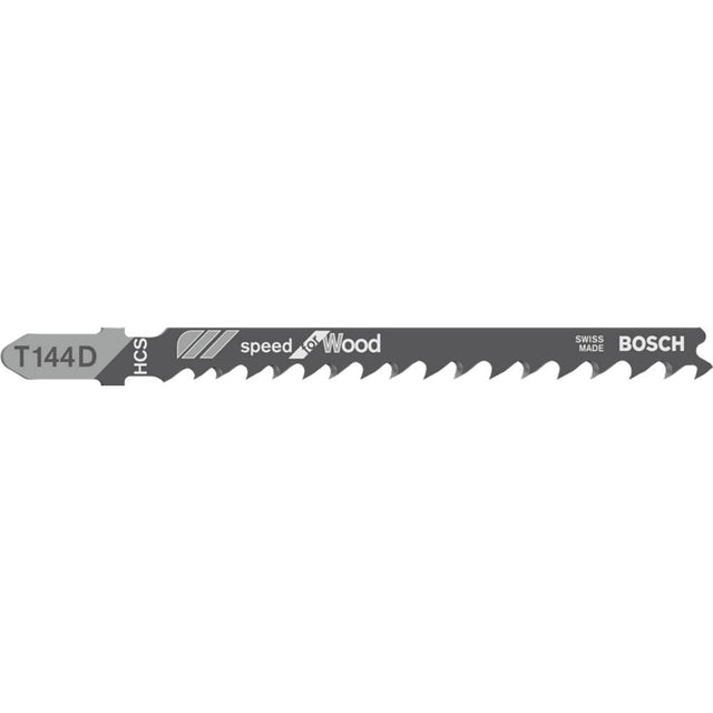 T 144 D Speed for Wood Jigsaw Blade delivers fast straight cuts in wood Sharp-ground, side-set teeth enable quick results High carbon steel material is appropriate for cutting softwood and non-abrasive woodworking materials Fits all T-shank jigsaws.