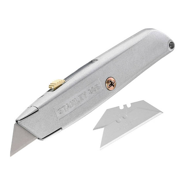 The Stanley 99E Original Retractable Blade Knife is made from grey painted die-cast metal body, which is ergonomically shaped for a good, comfortable grip. The blade extension can be controlled by the blade shifter, and 5 blade position allows a wider usage for a variety of cutting applications. The interlock nose firmly secures the blade into knife. For safety, the blade can be fully retracted into the body.