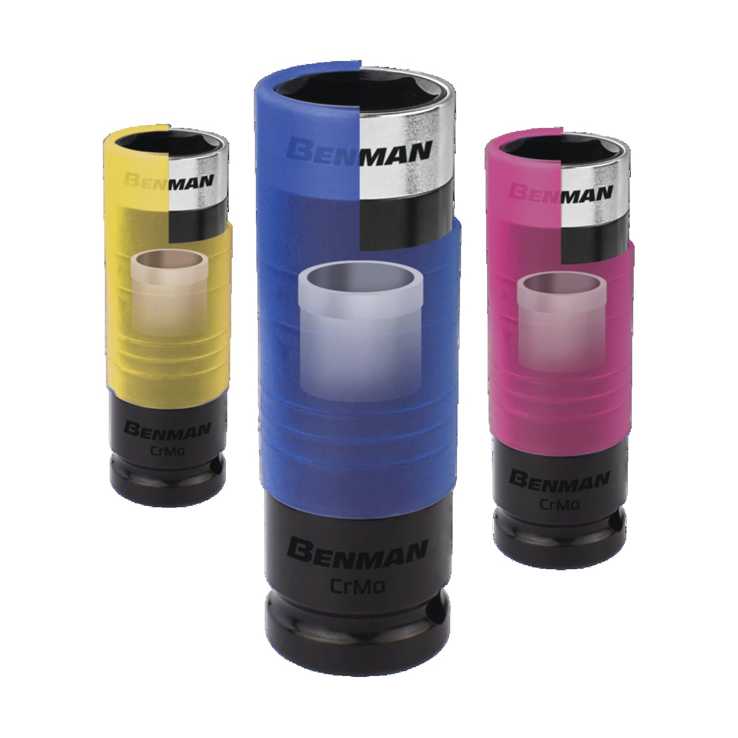 High strength reinforcing ring and impact socket for 3x longer life than regular thin wall impact sockets (Manufacturer’s test results on 19mm socket) Inner cover protects lug nuts and bolts from damage Thin wall socket design for access in confined spaces Protective cover prevents damage to wheels