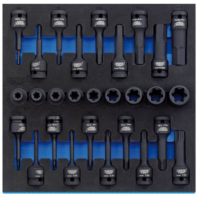 Expert Quality, items manufactured from chrome molybdenum steel, which is correctly hardened and tempered with a black phosphate finish. Supplied complete in a two tone 1/2 drawer EVA insert tray made from closed cell foam, overall size 270 x 276 x 30mm (w x d x h). Suitable to be used in Draper and Draper Expert tool chests and other manufacturers similar tool chests.
