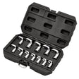 This flexible crowfoot socket wrench set is ideal for hard-to-reach areas, providing up to 110° access. Made from high-quality chrome vanadium steel for durability and strength. Satin chrome finish for corrosion protection. Suitable for all hydraulic, fuel, oil brake, A/C, O2 sensor and air line work. Sizes 8-19mm. Supplied inside a blow moulded plastic storage case.