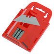 Blade size 60mm. Ideal for cutting card, paper, leather, carpet and more. Carbon steel blades. Long lasting. Fast cutting. Includes storage dispenser