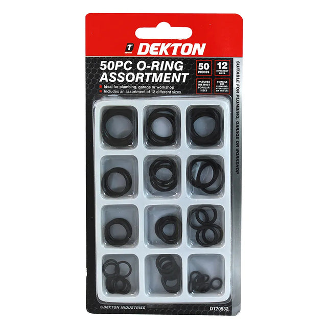 This DEKTON O Ring Set includes 50 precision-engineered O rings designed for reliable sealing in various applications. Crafted from durable materials, these O rings ensure long-lasting performance and resistance to wear, making them ideal for maintenance and repair tasks requiring expert-level quality and dependability.
