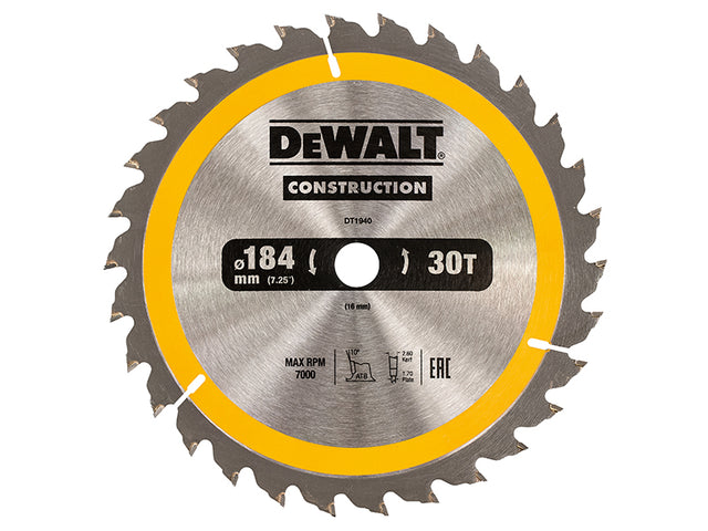 DEWALT Portable Construction Circular Saw Blade 184 x 16mm x 30T