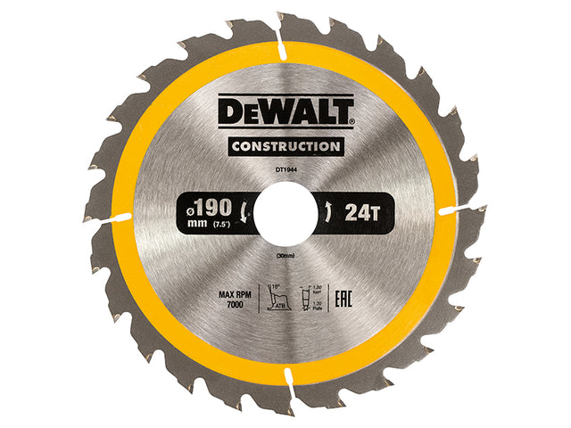 DEWALT Portable Construction Circular Saw Blade 190 x 30mm x 24T