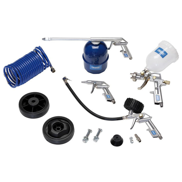 - Complete with a gravity fed spray gun, air blow gun, paraffin/washing spray gun, air inflator with clip-on hose and 5m coiled air hose with 1/4" BSP female threaded connectors
