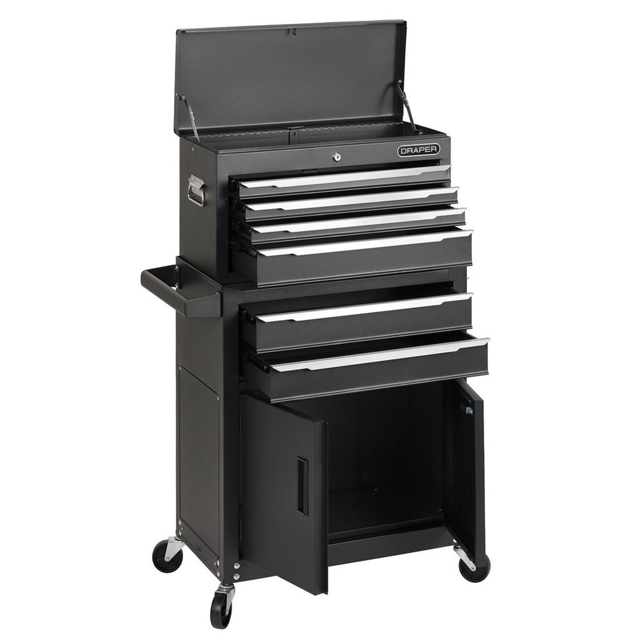 This workshop and garage storage solution features a tool chest with two drawers and two cupboards, as well as a roller cabinet with four drawers. They can be used individually or combined to suit the task at hand. Both are constructed from sheet steel and have a protective powder coated finish that guards against scratches and corrosion. The spacious drawers have a stylish silver trim and are equipped with ball bearing sliders for smooth operation, along with a 2mm EVA liner to protect tools and prevent them from sliding around. The worktop is also lined with EVA for added protection. For easy manouverability, the tool chest includes side handles, while the roller cabinet is equipped with a sturdy pull handle and four large steel castors - two fixed and two swivel with brakes. For security, the cabinet has two integral locks to safeguard tools and each comes with four keys.