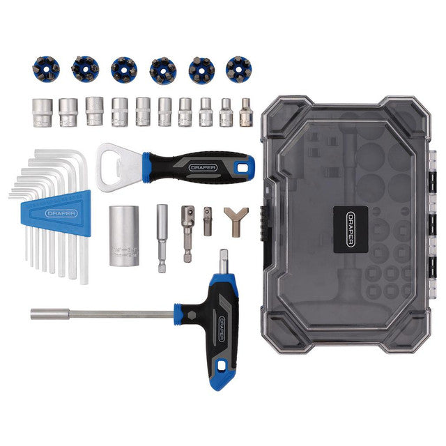 - Includes a soft grip T-handle, a wide range of 1/4" Sq. Dr. 6-point sockets and 1/4" hex. 25mm screwdriver bits, hex keys arranged in a holder and more