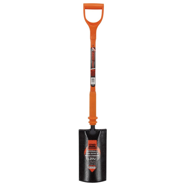 Fully insulated grafting shovel designed for working near live cables and wires. Individually tested to 10,000V, guaranteeing safe working on 1,000V and complying to the BS 8020 standards. Manufactured with an epoxy fibreglass core and attached to a fully enclosed insulated shaft with hand slip guard. Each shovel is Supplied with a certificate of conformity, which correlates with a unique traceability number embossed on the shaft.