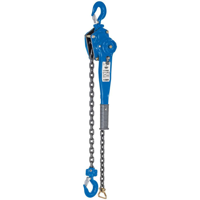Expert Quality, ideal for the workshop or factory use. The lever chain hoist has a totally enclosed pinion gear mechanism and load braking with double pawls. The free chain feature allows slack in the chain to be taken up prior to ratcheting. High quality welded chain with safety latches on the load hooks.