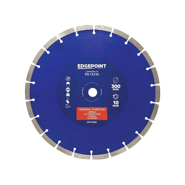 The EdgePoint GP10300 General-Purpose Diamond Blade has the following specification: Diameter: 300mmBore: 20mmSegment Height: 10mmSegment Width: 2.8mm