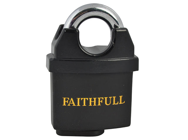 The Faithfull PVC Coated Brass Padlock has a brass body with a weatherproof PVC coating. The shackle is made from hardened steel.