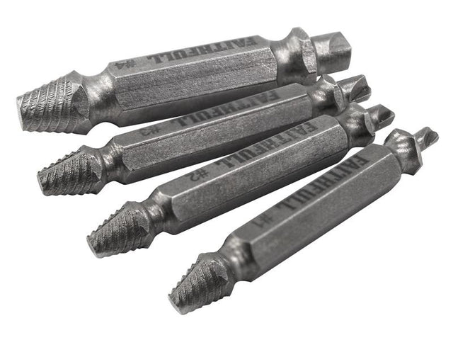 The Faithfull 4 Piece Screw Extractor Kit easily removes even the most damaged and hard to remove screws and bolts. The bits have a self-centring tip and are manufactured from hardened tool steel and double tempered for extra hardness. They will remove screws from wood, metal or plastic, or screws manufactured from any alloy including soft brass and free-spinning screws. Works on the following types of screw and bolts: Pozidrive, Phillips, Flat, Hex and Star Headed, even jagged and uneven breaks. They can be used with most power drills.