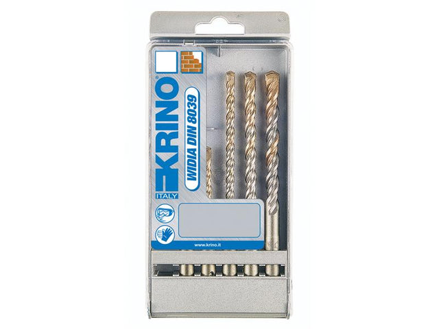 Krino SDS Plus Hammer Drill Bits with tungsten carbide tips for increased working life. For use on concrete, brick and other similar materials. Produced in accordance with DIN 8039. Supplied in a handy plastic carry case, providing easy storage and transportation.