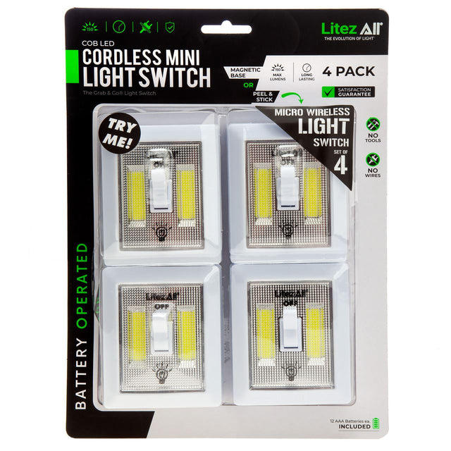 A four pack of our world famous LitezAll®The Evolution of Light® cordless light switches in a mini version. You get all of the mounting options of it's bigger brother including hook and loop tabs, magnets and keyhole mounts. Despite its size, you get a lot of light at approximately 150 max lumens from its energy efficient COB LEDs. LitezAll®The Evolution of Light® wireless light switches provide bright, shadow free, battery powered lighting in closets, under the sink, campers and tents, golf carts, out buildings and sheds.