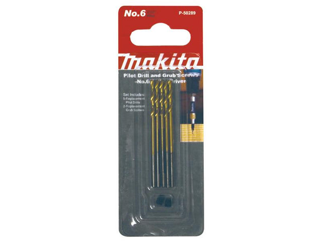 This Makita set includes 5 pilot drills and 2 grub screws.