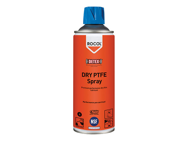 ROCOL DRY PTFE Spray is a non-toxic, non-staining dry PTFE lubricant, ideal for use in environments where wet lubricants cannot be tolerated, e.g. dusty environments such as paper mills and bakeries. Apply to pivots, links, pin and pulleys to prevent wear and extend component life. It is also ideal for use an as anti-stick agent on chutes and slides.