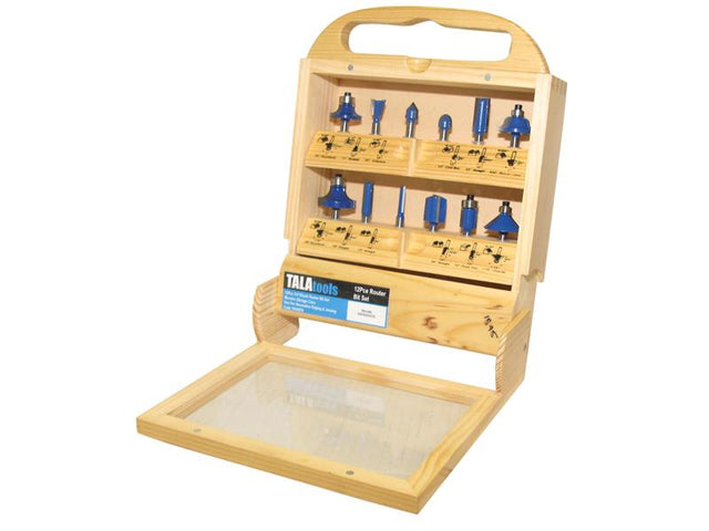 The Tala 12 piece Router Bit Set with 1/4in shank is supplied in a wooden storage case and contains: