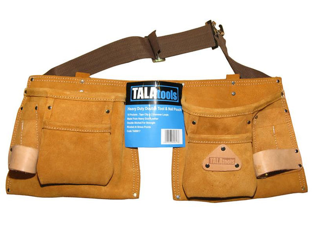 TALAtools Heavy-Duty Double Tool & Nail Pouch made from heavy-duty leather is double stitched for strength and riveted at stress points. With 10 pockets plus a tape clip and 2 hammer loops.