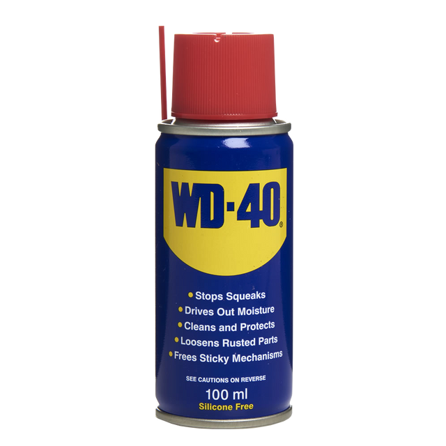 A 100ml aerosol can of WD-40 - the industry standard lubricant and solvent mix, which penetrates, disperses water and lubricates. It is ideal for cleaning machine parts prior to dismantling or repair, freeing and lubricating at the same time. Because of its electrically insulating properties, WD-40 is ideal for automotive electrics, where it readily displaces moisture and helps prevent tracking.